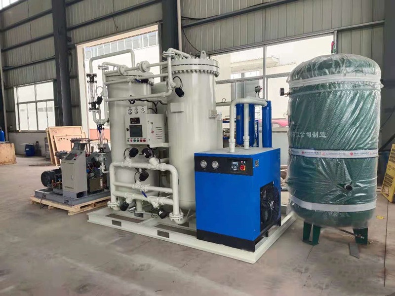 變壓吸附制氧裝置以潔凈的壓縮空氣為原料,采用高品質的沸石分子篩作為吸附劑,在一定的壓力下,從空氣中制取氧氣。經(jīng)過純化干燥的壓縮空氣,在吸附器中進行加壓吸附、減壓脫附。由于空氣動力學效應,氮在沸石分子篩微孔中擴散速率遠大于氧,氮被沸石分子篩優(yōu)先吸附,氧在氣相中被富集起來,形成成品氧氣。然后經(jīng)減壓至常壓,吸附劑脫附所吸附的氮氣等雜質,實現(xiàn)再生。一般在系統(tǒng)中設置兩個吸附塔,一塔吸附產(chǎn)氧,另一塔脫附再生,通過PLC程序控制器控制氣動閥的啟閉,使兩塔交替循環(huán),從而取得純度較高的氧氣(93%±3%)。